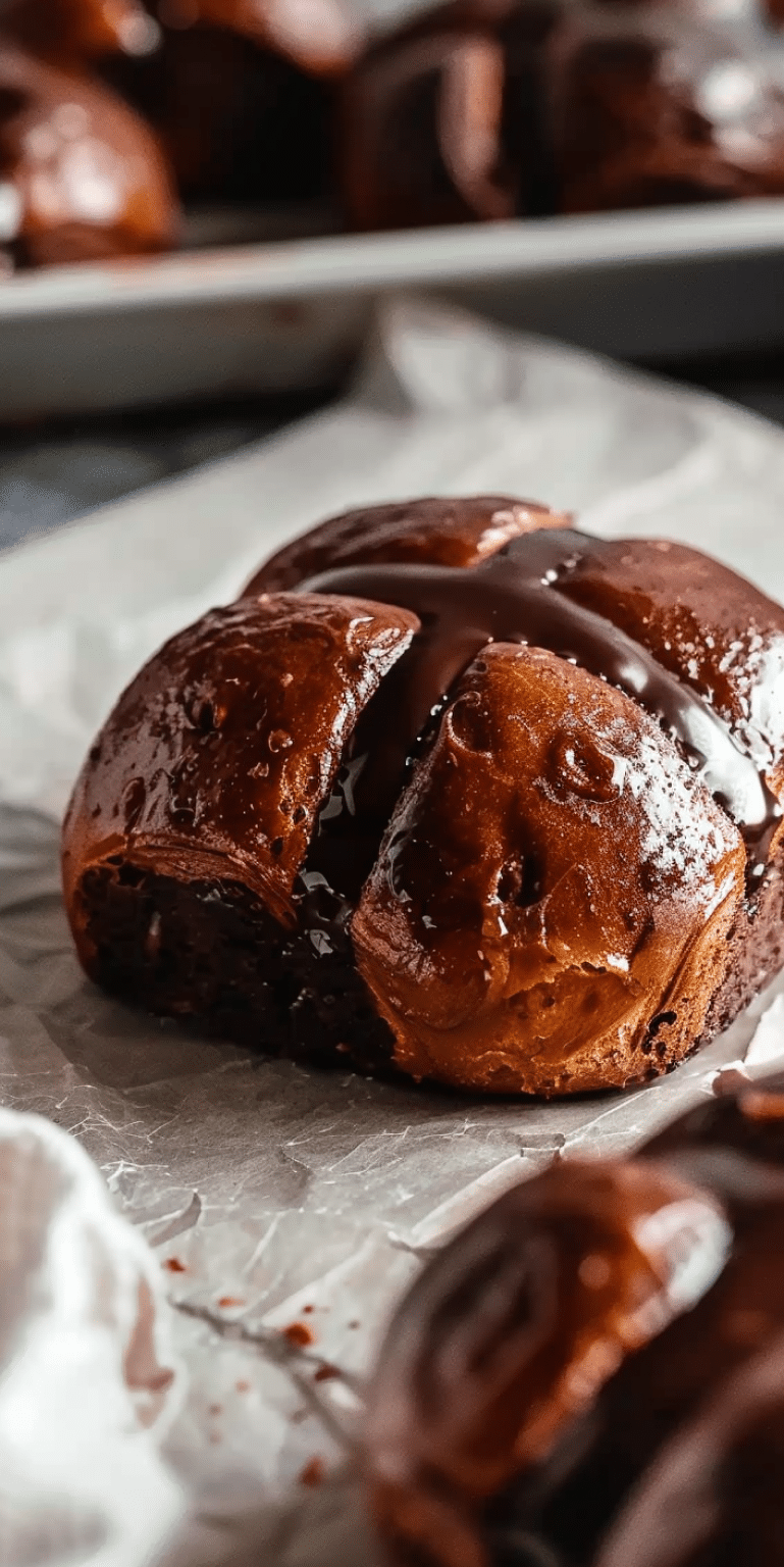 Serve these Brioche Chocolate Hot Cross Buns warm with a pat of butter, or enjoy them as is to fully appreciate their chocolaty richness. They pair beautifully with a cup of coffee or a glass of cold milk. For a festive brunch, serve alongside savory items to balance the sweetness of the chocolate.