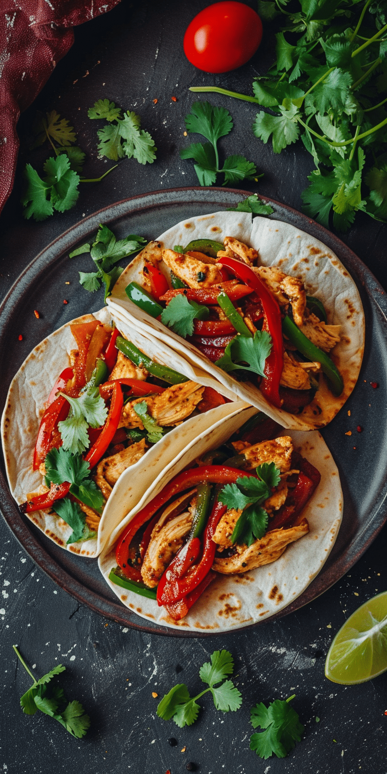 - Assemble Tacos: Place some of the cooked chicken and sautéed vegetables onto each tortilla.