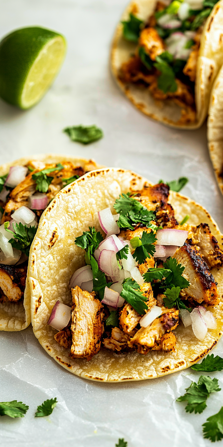 With minimal ingredients and a fast cooking time, these tacos are perfect for busy weeknights or a casual gathering. The fresh cilantro, onions, and lime add brightness and balance to the savory chicken, making these tacos light, delicious, and customizable to your taste.