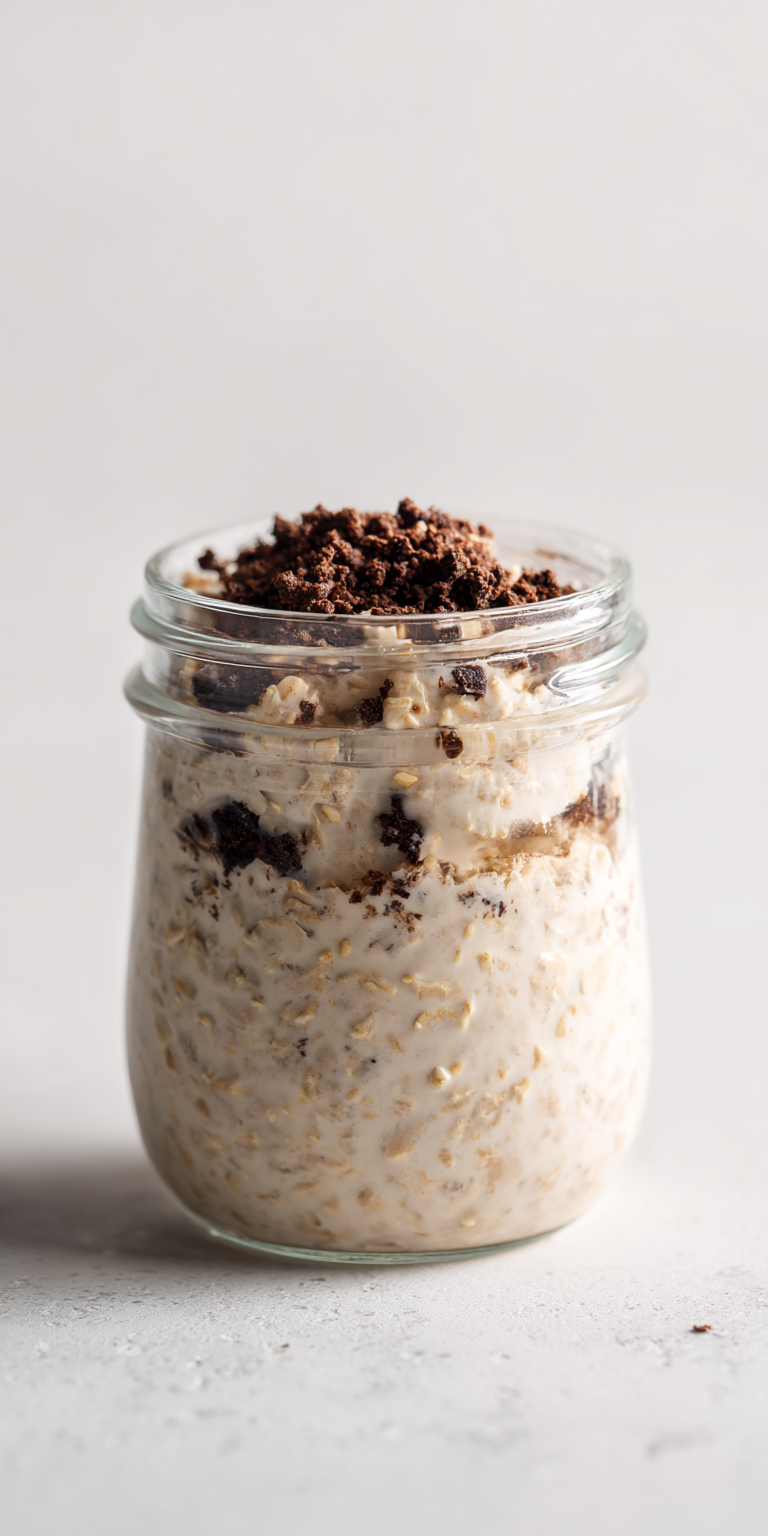 If you’re a fan of Oreos and breakfast in one jar, this recipe is your dream. It delivers chocolate cookie flavor, creamy texture, and a hint of vanilla sweetness—all packed with protein. It’s easy to prep, satisfyingly rich, and perfect for on-the-go mornings.