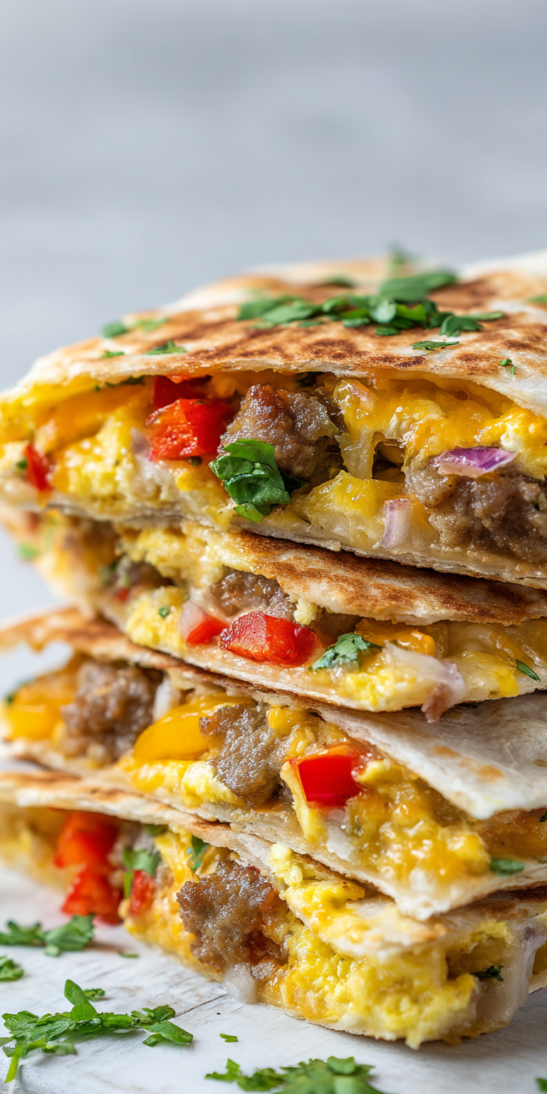 Loaded Breakfast Quesadillas are a hearty, flavor-loaded way to kickstart your morning, packed with savory sausage, fluffy eggs, melty cheese, and a colorful mix of onions, bell peppers, and fresh cilantro. This dish blends the handheld ease of Mexicoโs quesadillas with the bold, comforting flavors of a classic breakfast in the United States. With every bite, you get a perfect mix of richness, freshness, and satisfying crunch.