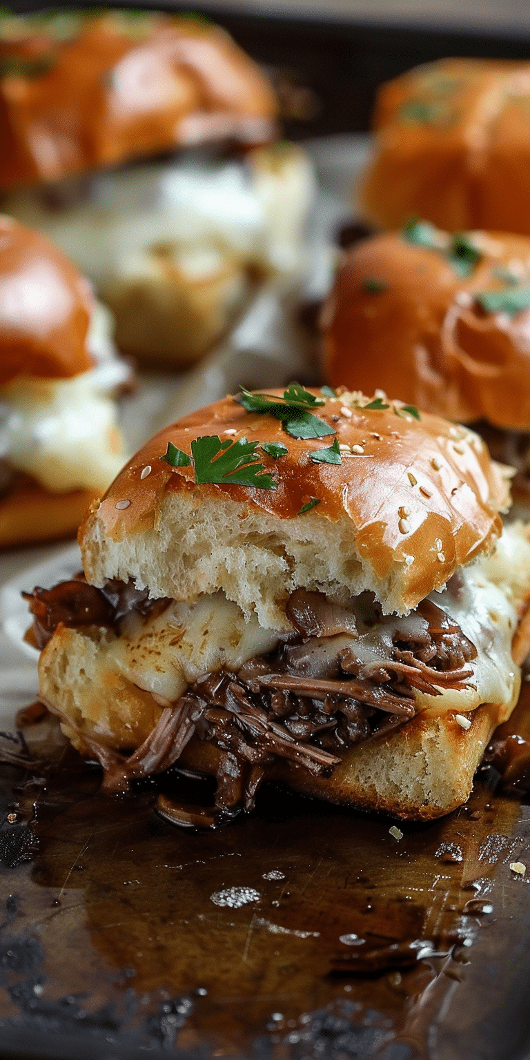 - Serve: Slice into individual sliders and serve with a small bowl of au jus for dipping.