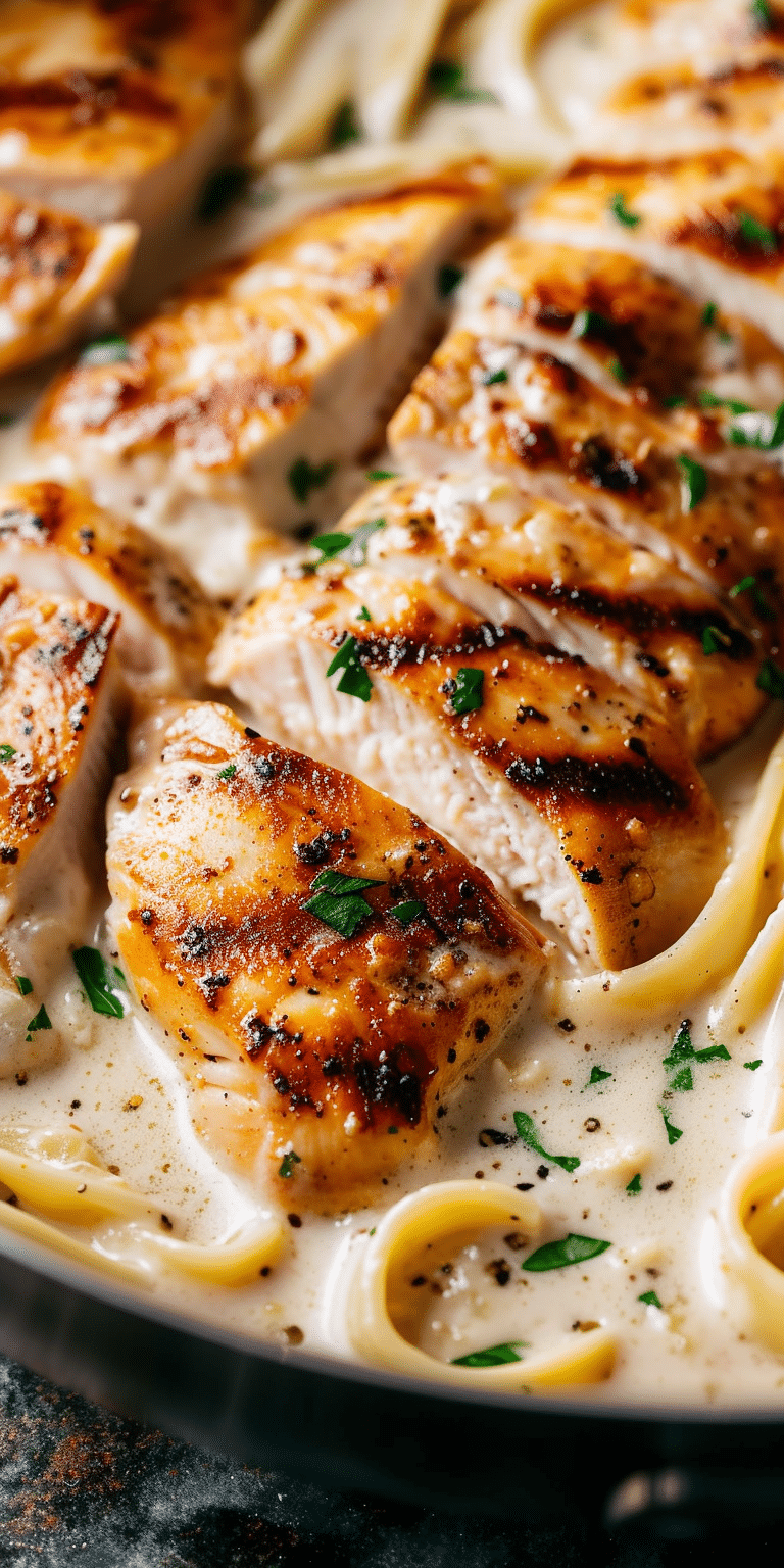 Grilled Chicken Alfredo is a creamy, indulgent pasta dish featuring tender, smoky grilled chicken breasts served over a rich and velvety Alfredo sauce. This classic Italian-American favorite combines the satisfying flavors of garlic, Parmesan cheese, and heavy cream with perfectly cooked pasta and succulent chicken. Ideal for a comforting weeknight dinner or a special occasion, Grilled Chicken Alfredo is sure to please any crowd.